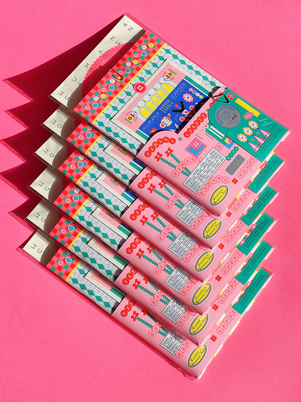Humana Garden Zine is about a personal and butterfly-free garden, inspired by the artist’s lepidopterophobia (fear of butterflies).This zine includes a foldable silver-ink sleeve featuring exotic plants, a colorful illustrated booklet, and a reversible flower pot art print. It invites readers into a quiet, imagined nature—one that offers beauty without anxiety.