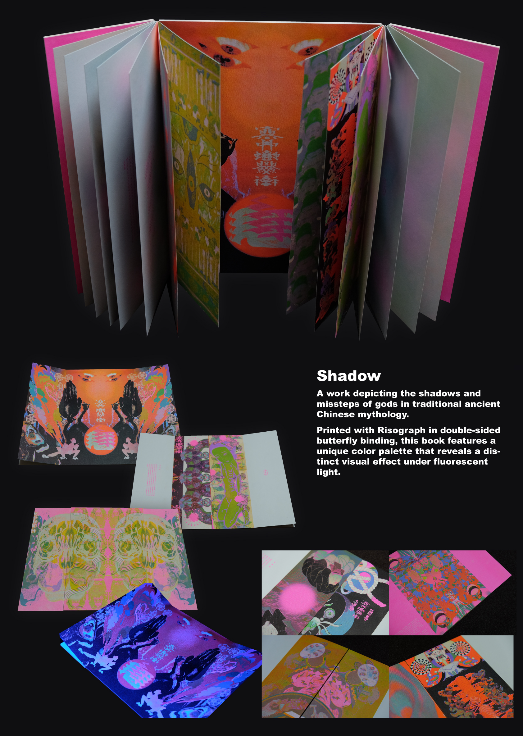 《Shadow》A work depicting the shadows and missteps of gods in traditional ancient Chinese mythology.Printed in Risograph, double-sided with butterfly binding.