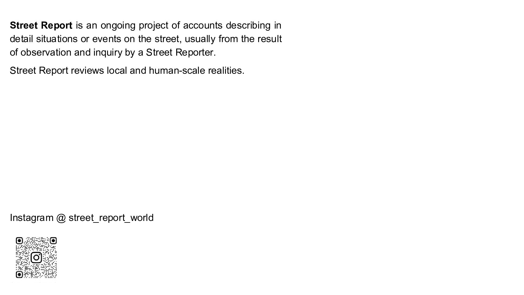 Street Report is an ongoing project of accounts describing in detail situations or events on the street, usually from the result of observation and inquiry by a Street Reporter. Street Report reviews local and human-scale realities.