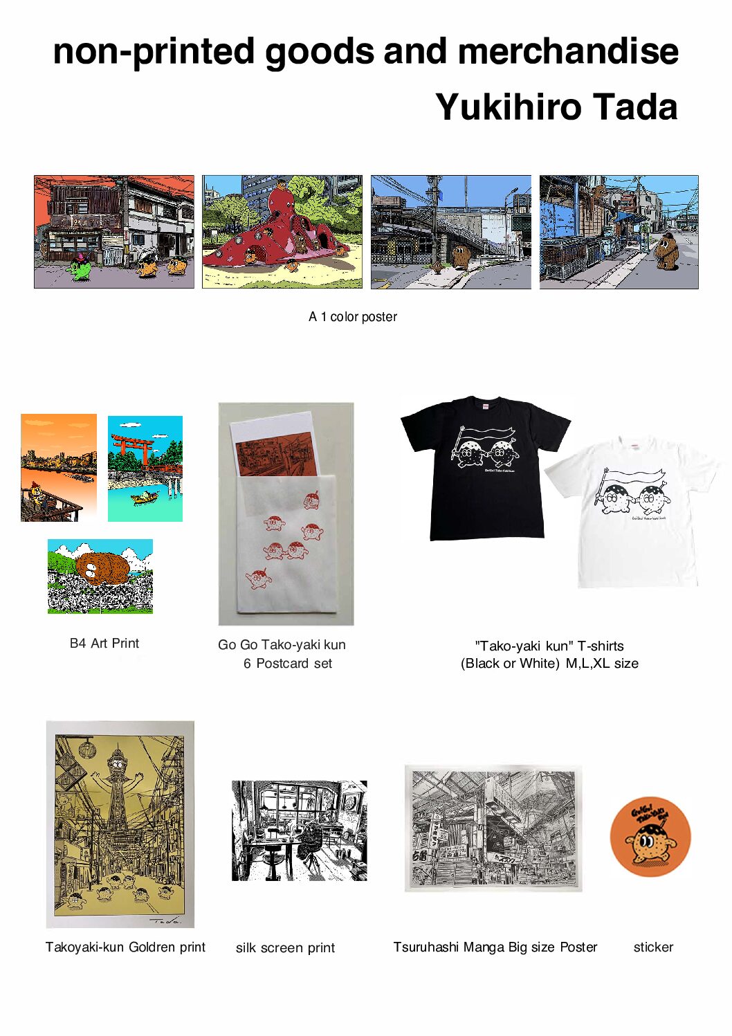 Illustrator, Comic artist, Character designer based in Osaka, Japan. His representative works are character illustrations of "Mosh" and "Tako-Yaki kun". He holds exhibitions and workshops not only in Japan but also in Taiwan, Korea, Malaysia, Germany, etc. He often creates works based on the casual sights and moments discovered during walking and traveling. Recently, he has been drawing illustrations of Pokémon Trading Card Game. MOSH MOSH BOOKS is the independent label in Osaka that deals with Yukihiro Tada's art books, prints and merchandise.